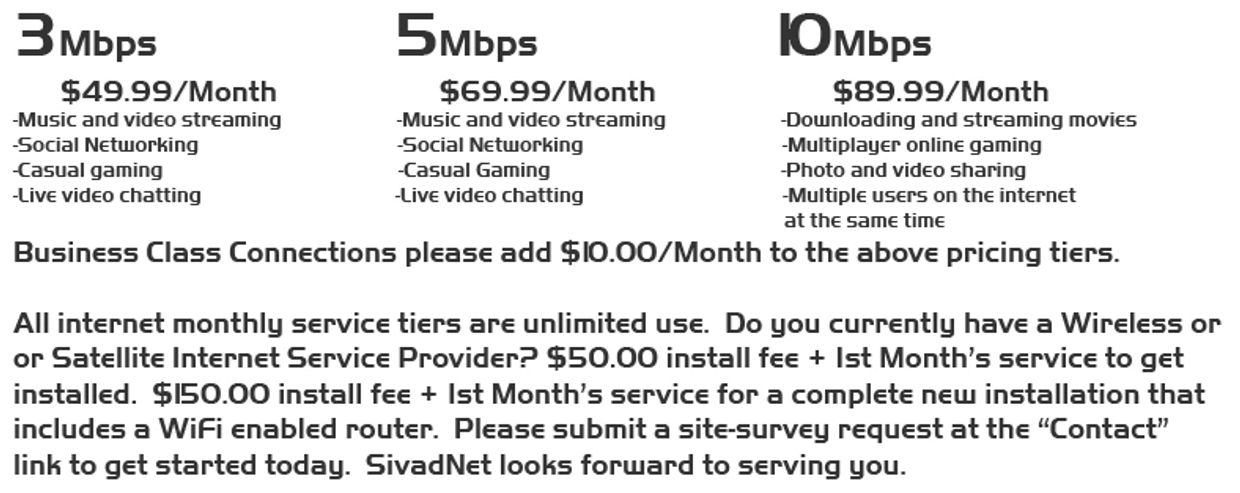SivadNet was started in the fall of 2013. It's founder has had experience in dealing with the build out of Wireless Internet Service Provider networks since 2005. He has had an instrumental role in the construction, maintenance, support, and build out of such other major wireless internet service provider networks as Advantas, Crestone Telecommunications, and is an involved partner in Colorado Central Telecom. Now, SivadNet owned and operated by it's founder, intends on proudly serving the community of Navajo Dam, Turley, Ash Fork, and beyond in the same manner in which customers of Advantas, Crestone & Colorado Central Telecom have experienced for years. SivadNet looks forward to giving you the internet and customer service experience that you deserve.